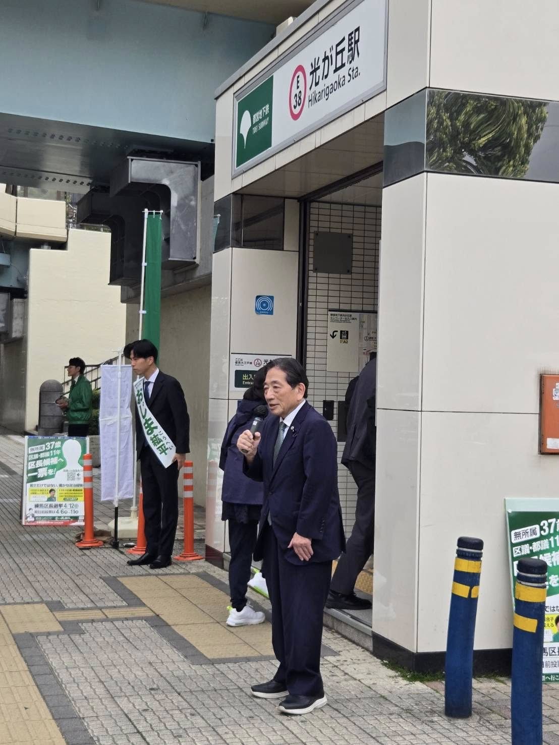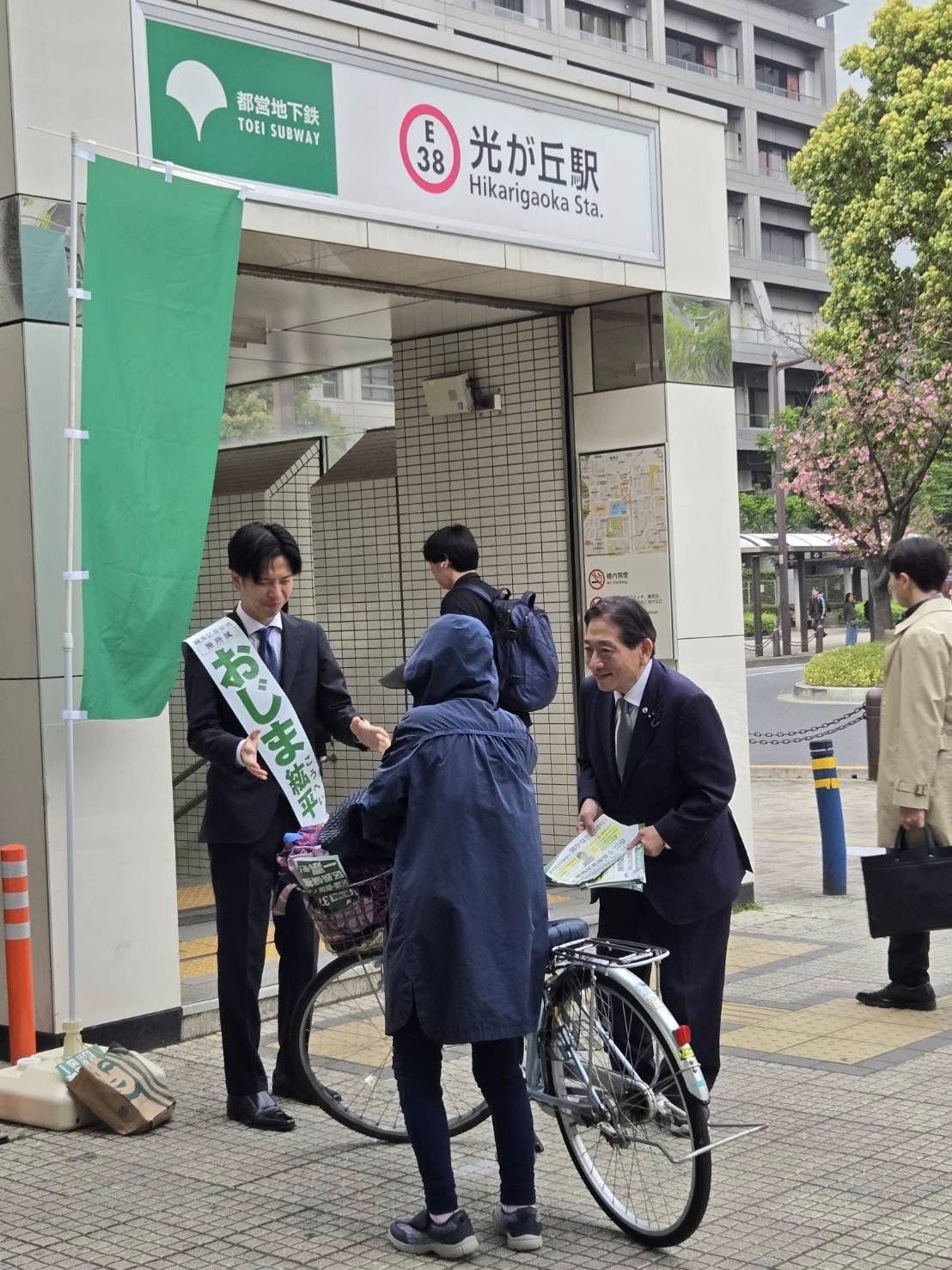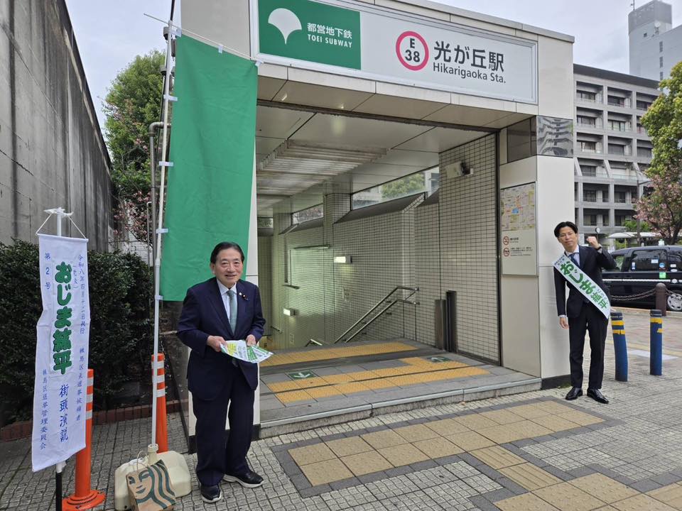 練馬区長選挙3日目の本日は、大江戸線・光が丘駅にて尾島紘平候補とともに朝のごあいさつに立たせていただきました。